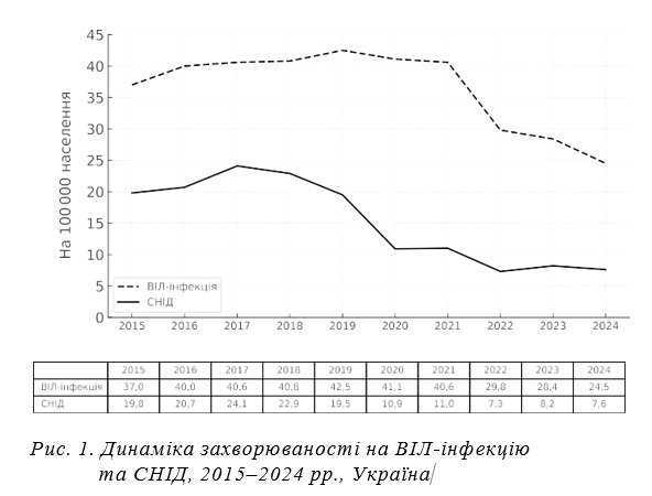 Методи дослідження: бібліосемантичний, системного підходу та аналізу, ретроспективний епідеміологічний аналіз захворюваності на ВІЛ-інфекцію в Україні за 2015–2024 рр. за матеріалами статистичної звітності.
