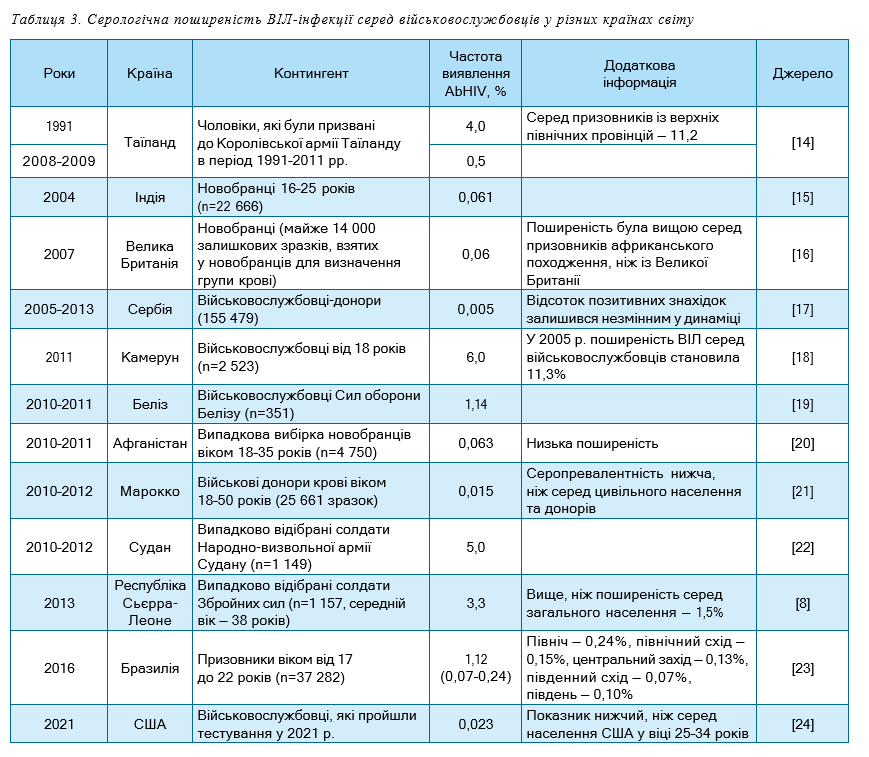 В таблиці 1 у хронологічному порядку наведено дані щодо серопревалентності ВІЛ-інфекції серед військовослужбовців різних країн світу. Як бачимо, поширеність ВІЛ-інфекції у минулому, так і в теперішній час нижча, ніж HCV-інфекції і суттєво нижча — ніж HBV-інфекції.