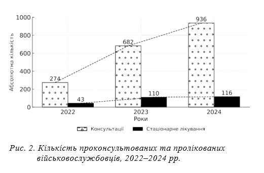 У 2022–2024 рр. кількість військовослужбовців ЗСУ, Національної гвардії (НГУ) та Служби безпеки України (СБУ), які отримували стаціонарне лікування та були проконсультовані в Клініці Інституту, суттєво збільшилась (рис. 2). Сумарно, з початку повномасштабних військових дій, амбулаторну допомогу отримали 1 892 військовослужбовці, стаціонарне лікування — 269.