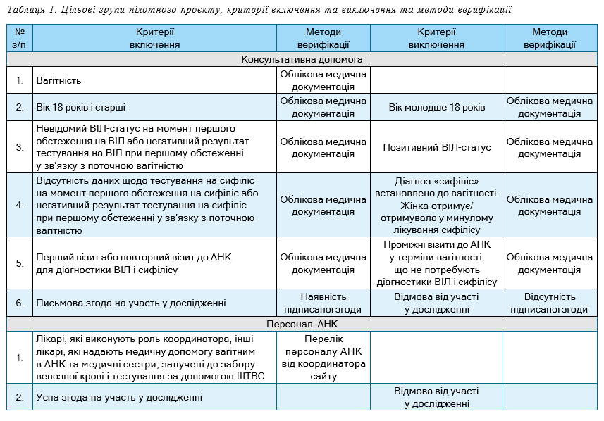 Отже питання доступності та якісної організації процесу діагностики ВІЛ-інфекції та сифілісу у вагітних є актуальним і зумовлює необхідність його удосконалення в Україні. Впровадження тестування вагітних за допомогою ШТВС та його масштабування потребує окремого вивчення, що було здійснено у межах пілотного проєкта «Впровадження використання подвійних швидких (експрес) тестів для діагностики ВІЛ та сифілісу в АНК, з подальшою імплементацією в систему охорони здоров’я України» (далі — пілотний проєкт).