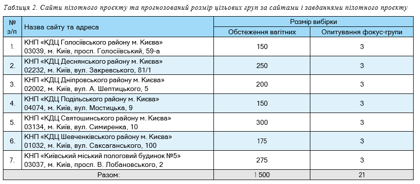 Заплановані сайти пілотного проєкту і розмір цільової групи за сайтами відповідно до визначених завдань представлено у табл. 2.