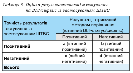 Визначення показників результативності скринін- гового тестування на ВІЛ та сифіліс з використанням ШТВС базувалося на порівнянні з результатами тестування з використанням ІМ: 1) були розраховані показники чутливості та специфічності методу діагностики ВІЛ/сифілісу із застосуванням ШТВС; 2) розраховані показники значущості позитивного (PPV) та негативного (NPV) прогностичних значень отриманих результатів при тестуванні ШТВС; 3) отримані показники абсолютної кількості та відсоток недійсних результатів тестування із застосуванням ШТВС (табл. 3).