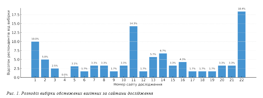 Відповідно до сформульованих завдань проєкту було набрано 1 510 респонденток з числа вагітних жінок, 14 записів виключено через невідповідність критеріям відбору, відтак до обстеження було залучено 1 496 жінок. Набір респондентів проводився у м. Києві на базі 22-х ЗОЗ та їх філій (рис. 1).