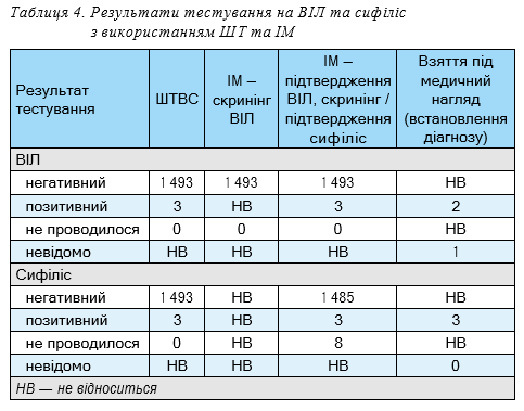 Показники результативності скринінгового тестування на ВІЛ та сифіліс з використанням ШТВС та рутинного тестування за допомогою ІМ розраховувалися серед жінок, яким проведено тестування як ІМ, так і ШТВС: ВІЛ — 1 496 жінок, сифіліс — 1 488 жінок.