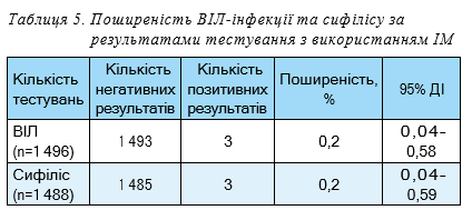 Усі вагітні, які відповідали критеріям включення та надали згоду на учать у пілотному проєкті, були протестовані на наявність серологічних маркерів ВІЛ та сифілісу з використанням ШТВС (n=1 496). Серед проведених ШТВС тестувань на ВІЛ та сифіліс було отримано по три позитивних результати (всього шість позитивних результатів). Вагітних, які одночасно мали позитивний результат тестування на ВІЛ та сифіліс виявлено не було. При проведені тестування за допомогою ШТВС не було отримано жодного недійсного результату (табл. 4).