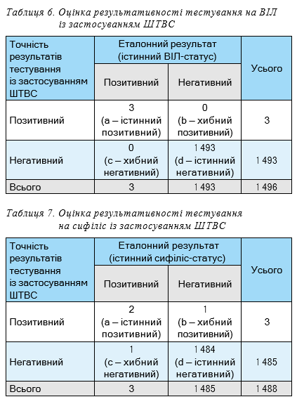 Численні дослідження доводять ефективність ШТВС у діагностиці як ВІЛ-інфекції, так і наявного або перенесеного у минулому сифілісу. Більшість тестів, що доступні для застосування, зокрема в Україні, мають чутливість при тестуванні на ВІЛ більше 99% та специфічність більше 98%, при тестуванні на сифіліс чутливість становить більше 90%, а специфічність не менше 96%, що підтверджується багатьма дослідженнями [9, 10, 11]. Проте, слід зазначити, що реактивний результат тестування з використанням подвійних ШТВС для будь- якої з даних інфекцій не є остаточним та потребує додаткових лабораторних досліджень, відповідно до національної стратегії тестування.