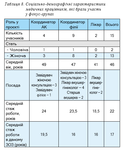 У межах виконання завдання щодо оцінки готовності персоналу АНК проводити тестування вагітних на ВІЛ та сифіліс з використанням ШТВС було проведено три фокус-групи (ФГ) по 5 учасників кожна, тобто 15 учасників проти 20–22 медичних працівників, згідно з протоколом (табл. 8). Дані зміни були зумовлені воєнним станом, введеним у країні, що призвело до змін у роботі співробітників АНК, відсутністю зв’язку з деякими учасниками проєкту, відсутністю безпечного місця для участі у ФГ, а також онлайн форматом дискусії, в якому важче утримувати фокус більшої аудиторії учасників.