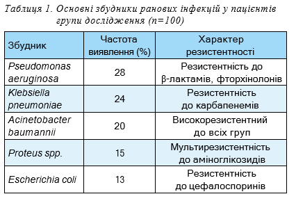 Результати дослідження та їх обговорення. При мікробіологічному обстеженні пацієнтів групи дослідження були встановлені такі бактеріальні ізоляти, виділені безпосередньо з гнійного вмісту ран (табл. 1).