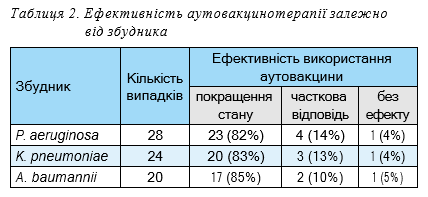 У процесі клінічного застосування індивідуально виготовлених аутовакцин у пацієнтів із тяжкими рановими інфекціями, спричиненими мультирезистентними штамами, було отримано позитивні результати у більшості випадків. Повне клінічне поліпшення з ознаками регресії запального процесу, очищення рани та формування грануляцій спостерігалося у 83% пацієнтів. У 15% випадків відзначено часткове покращення, яке дало змогу продовжити лікування без потреби в ампутації чи радикальних хірургічних втручаннях. Лише у 2% пацієнтів ефект від терапії був відсутнім, що переважно зумовлювалося тяжкими імунодефіцитними станами або глибокими некротичними ураженнями. Дані наведено у табл. 2.