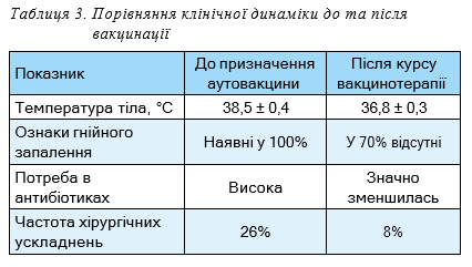 Нами була оцінена клінічна ефективність використання аутовакцин. Після проведення курсу аутовакцини у всіх пацієнтів спостерігалась нормалізація температури тіла, у 70% пацієнтів зникли прояви гнійно-запального процесу в рані, частота хірургічних ускладнень знизилась з 26% до 8% (табл. 3).