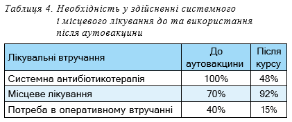 Цікаво, що в багатьох випадках введення аутовакцини дозволяло зменшити або навіть повністю відмовитися від системної антибіотикотерапії, що знижувало медикаментозне навантаження та потенційний ризик побічних ефектів. За даними нашого спостереження, після проведення курсу системного використання антибіотикотерапії, продовження лікування аутовакциною потребували 48% пацієнтів, а оперативного втручання тільки 15% пацієнтів (табл. 4). Таким чином, терапія аутовакциною є не лише ефективною, а й економічно доцільною в умовах дефіциту ресурсів.